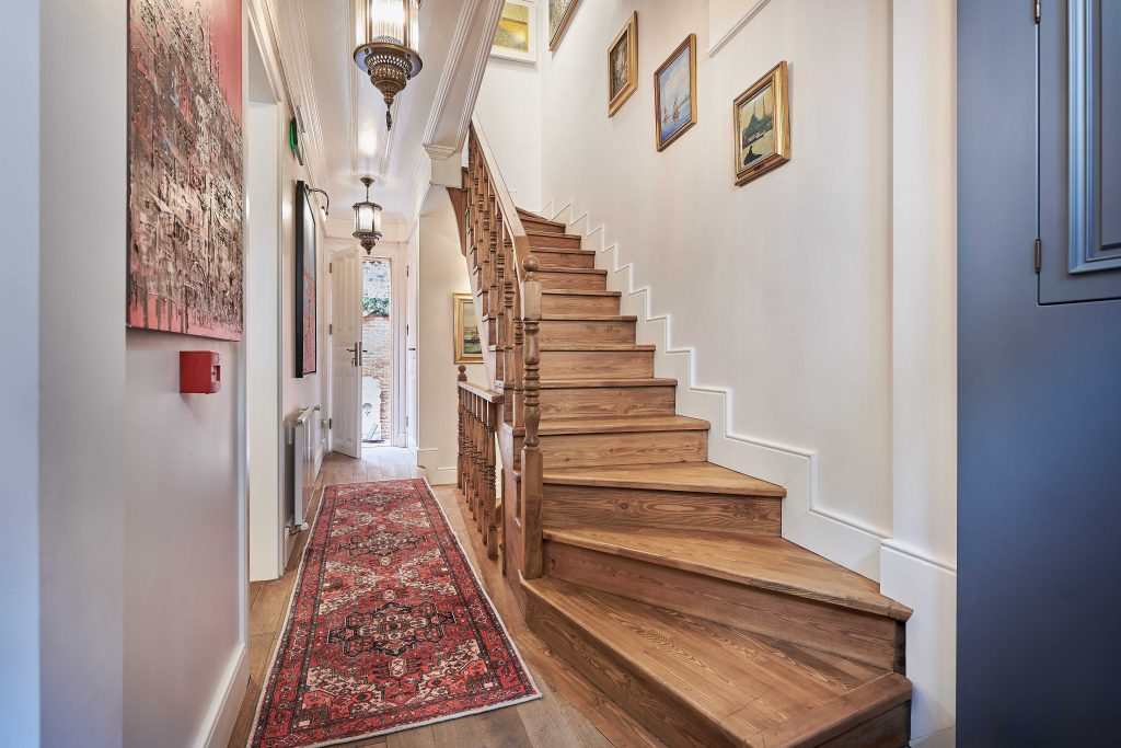 On the top floor, discover the luxurious main bedroom featuring a sumptuous king-size bed, along with a cozy second bedroom that invites relaxation with its two comfortable single beds. Indulge in the chic full bathroom, designed with a lavish rain shower and exquisite handmade tiles that evoke a serene spa-like ambiance.